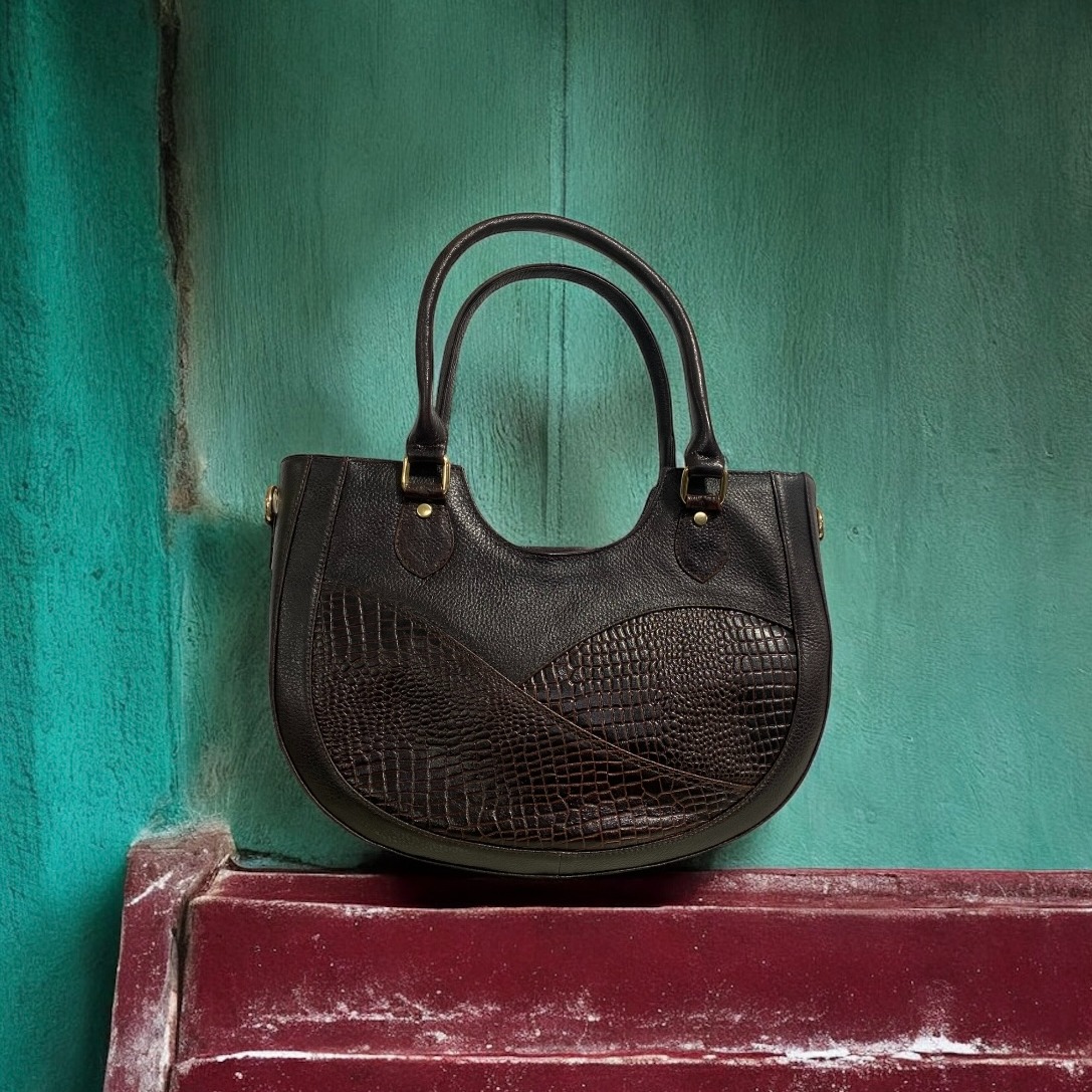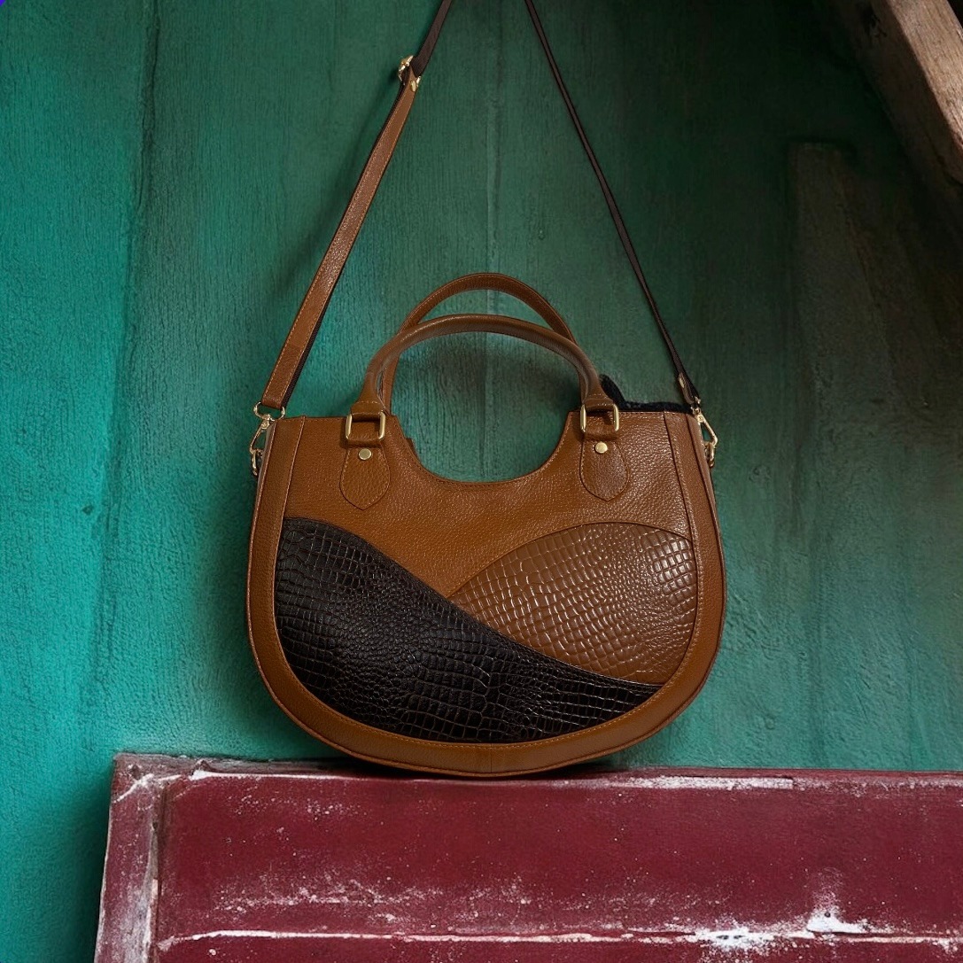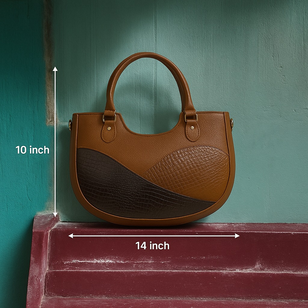Make a bold style statement with our Two-Tone Textured Leather Handbag. Crafted from premium faux leather, this chic handbag features a unique combination of smooth and textured panels in warm brown and deep black tones. Designed for the modern woman, it offers ample space for essentials while maintaining a compact, classy silhouette. The sturdy double handles and structured form make it ideal for both casual and formal occasions.